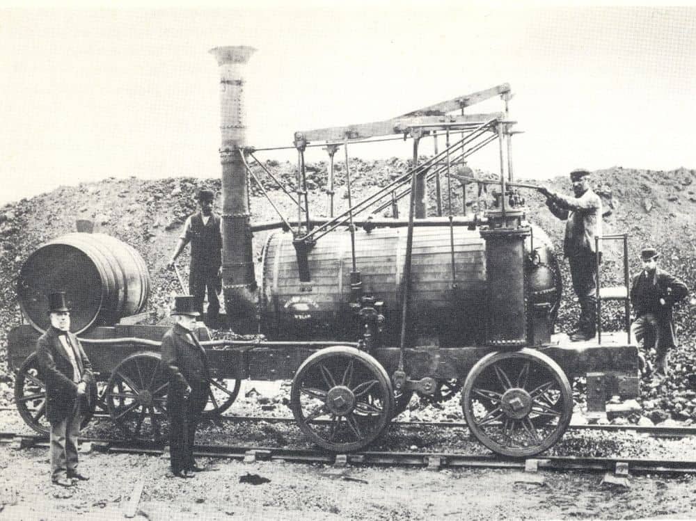 Wylam Puffing Billy of 1815 as it was around 1864; the two sons of William Hedley alongside to left.