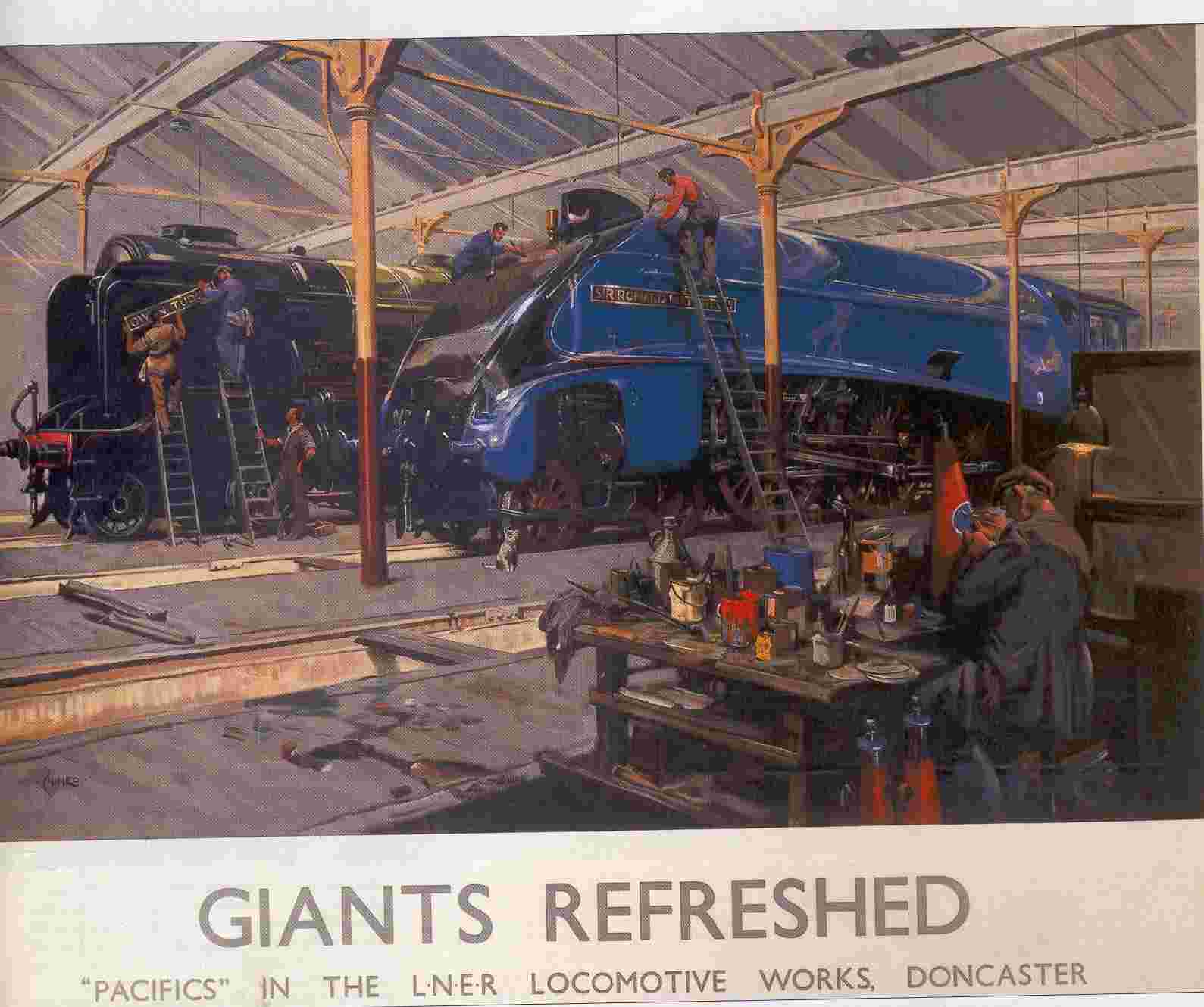 Terence Tenison Cuneo was probably the greatest artist to portray the steam locomotive. He was born on 1 November 1907 and died on 3 January 1996. His work was greatly associated with railway posters, the first of which, Giants Refreshed, was sponsored by the LNER (and was initially issued as a small colour separate with the LNER Magzine? Beverley Cole, Curator in charge of paintings and posters at NRM, has written a biography for ODNB wherein it is noted that Cuneo was an official artisit at the Coronation of the Queen in 1953. Cuneo was noted for placing a mouse in most of his paintings. Cuneo has an excellent page on the Guild of Railway Artists website.