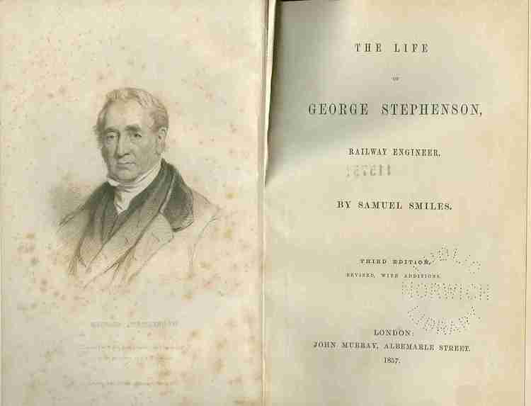 Smiles was born in Haddington on 23 December 1804 and died in Kensington on 16 April 1904. He trained as a medical doctor and actually practiced from 1832 to 1838. He the took up editorial work and became assistant secretary to the Leeds & Thirsk Railway. He then became Secretary of the South Eastern Railway. He met George Stephenson for the first time at the opening of the North Midland Railway. He was the author of several books, notably Self-help and Lives of the engineers As a young man he was a radical, but gradually moved to the right (he was a Unionist on the Irish issue) and was an advocate of public libraries. He is the subject of an entry in the ODNB by H.C.G. Matthews (biographer of over 700 entries, including George V and George VI).
