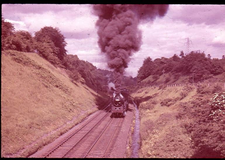 Clan on freight in eruption on Neilston bank, summer 1960 (some saw the Standards as a cloud on the horizon). Sorry for the Gevaert "colour" and Scottish yellow/grey weather |