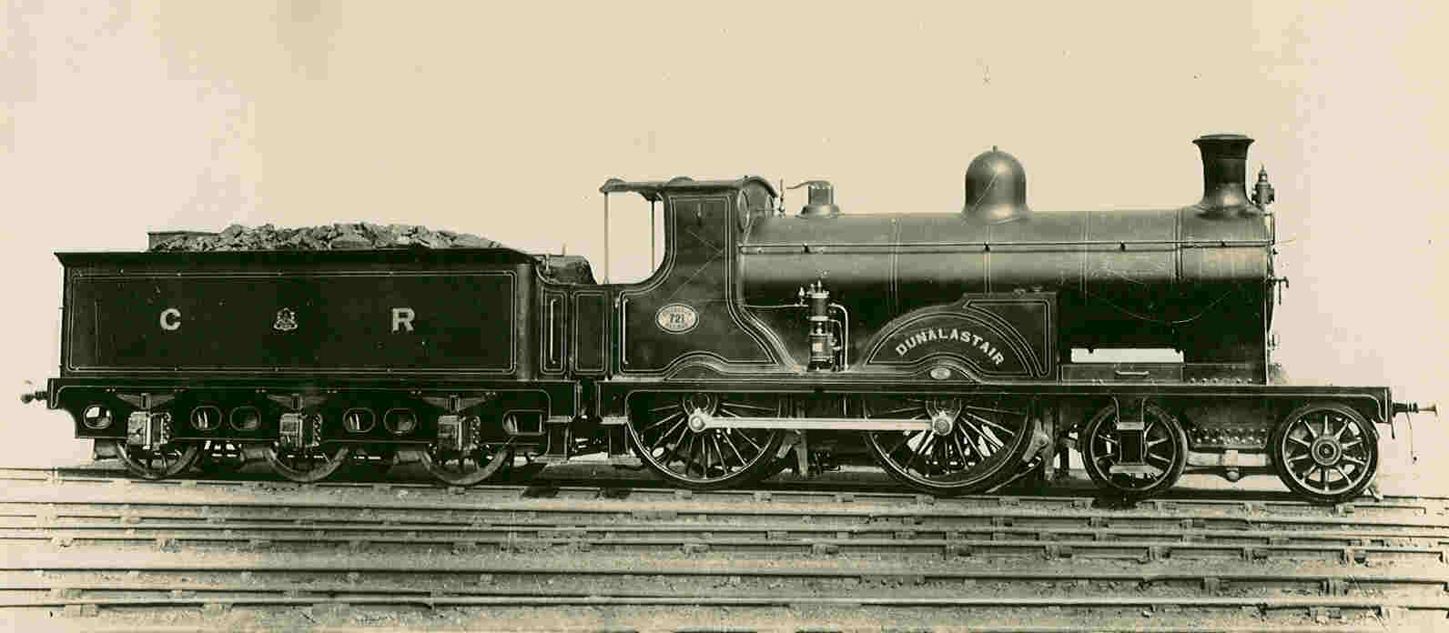 Caledonian Railway 4-4-0 Express Passenger Locomotive No.721 - Dunalastair. This locomotive was built in the Company's St. Rollox Workshops in 1896 to the designs of J.F. McIntosh, Locomotive Superintendent. The cylinders were 18¼in dia. by 26in stroke and the coupled wheels were 6ft 6in dia. Boiler pressure160 lbs per sq. in. Weight of engine and tender in working order - 86 tons. This was one of the most successful engines of its time and when first p1aced in service created a sensational performance in working the west coast tourist express trains over the Caledonian section, the journey between Carlisle and Stirling - a distance of 117¾ miles in 125 minutes.
