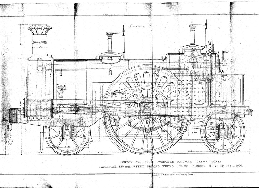 Francis Trevithick was born in Cornwall in 1812. He was a son of 'the Cornish giant' Richard Trevithick, but hardly knew his father, for Richard was much away from home and was not there at all from 1816 until the end of 1827. Francis had his early training in civil engineering under Locke from 1832, and was appointed resident engineer of the GJR at the Birmingham end of the line in 1840. As from 1 September 1841 he became locomotive superintendent of the company at Edge Hill, and like Buddicom without any previous experience of locomotive work. He elaborated the plans for Crewe works and had charge of the erection and equipment; also he had the conduct of the whole locomotive department and then that of the Northern Division of the LNWR, including running. Under him the Crewe-type locomotive was developed from Buddicom's prototype Aeolus, and he was content to build nothing else until he left Crewe in 1857. This contentment is clearly evident in the long extract which concludes this page.